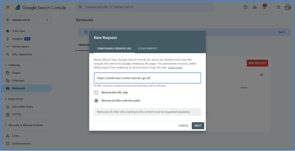 E. Klik menu Indexing -> Removals dan masukan alamat web yang terkena judul. Misal https://subdomain.contoh- go.id/ atau untuk spesifik path menjadi https://subdomain.contoh-domain.go.id/uploads/. Dan pilih “Removal all URLs with this prefix”